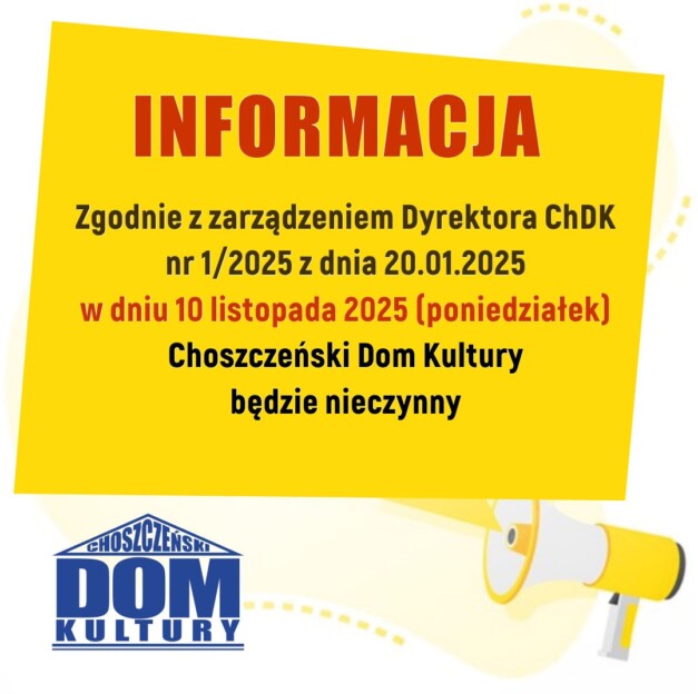 Zgodnie z zarządzeniem Dyrektora ChDK nr 1/2025 z dnia 20.01.2025 (dotyczące dnia wolnego za 1 listopada 2025, który wypada w sobotę) w dniu 10 listopada 2025 (poniedziałek) Choszczeński Dom Kultury będzie nieczynny. Za utrudnienia przepraszamy.